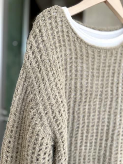 起毛糸を使ったメッシュ編みがふんわりと優しい印象を与えるニットトップスとインナーのセット。
