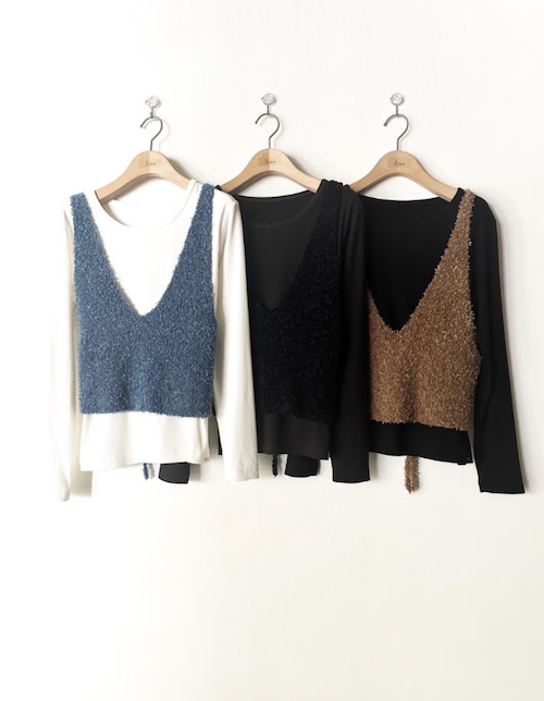 ふわっとしたファンシーヤーンのベストと長袖カットソーのセット。