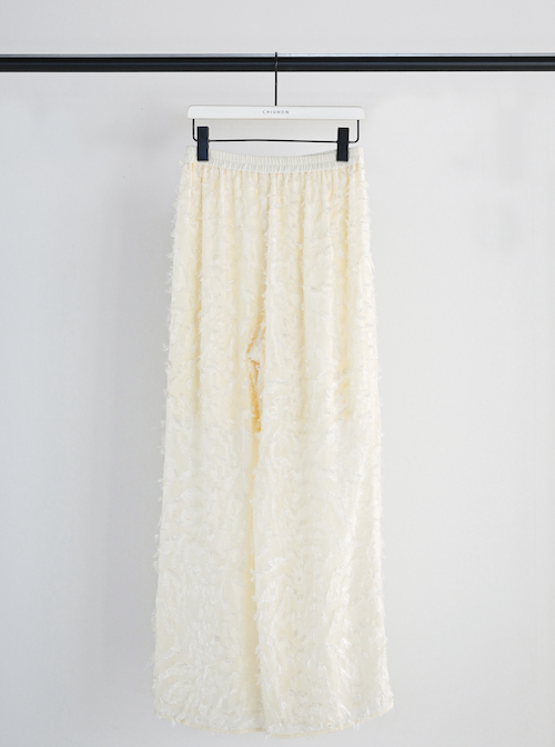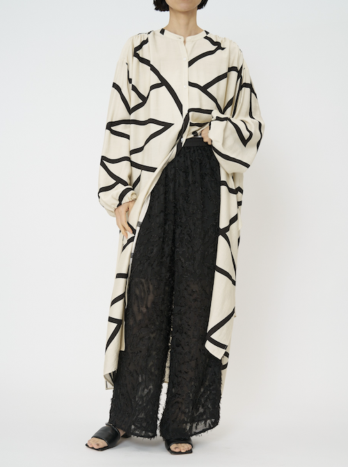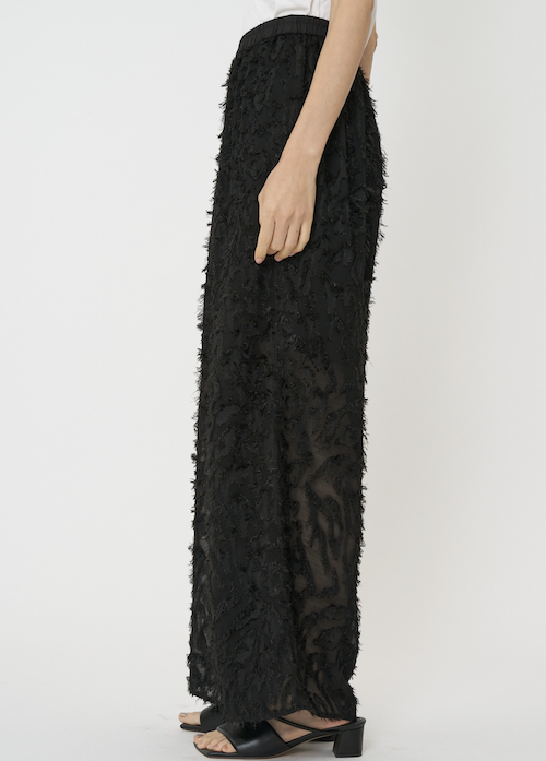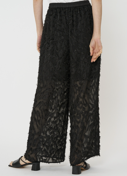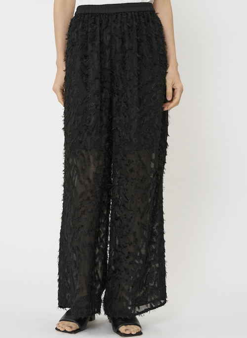 メッシュ素材にカットジャガードがドッキングされた目新しい素材を使用したイージーワイドパンツです。