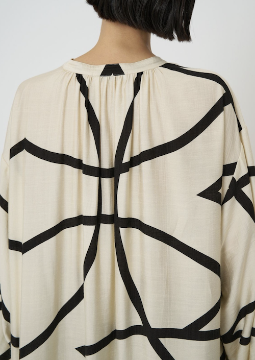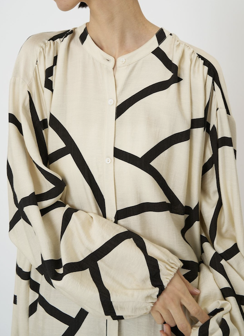 さらりとした素材感とゆとりのあるシルエットで、袖口にはさりげないギャザーを寄せ、ボリュームのあるスリーブが女性らしい柔らかさをプラス。