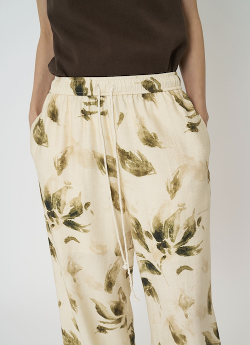 大胆なフラワー柄がスタイリングにアクセントを加え、シンプルなトップスと合わせるだけで印象的な着こなしに。
