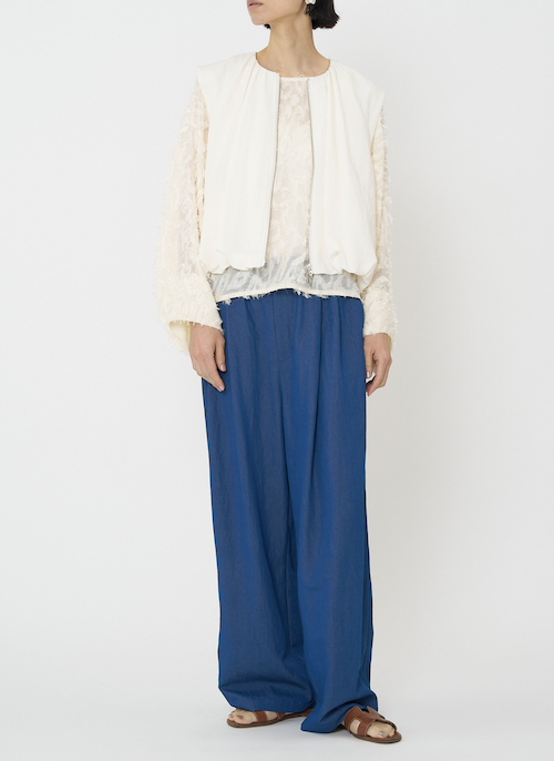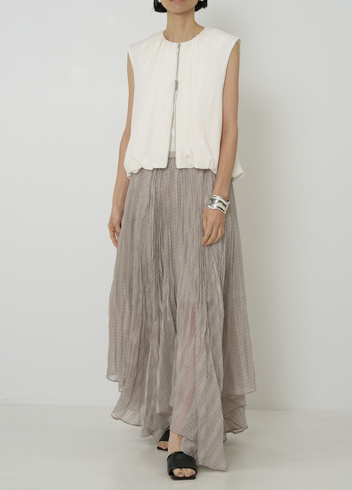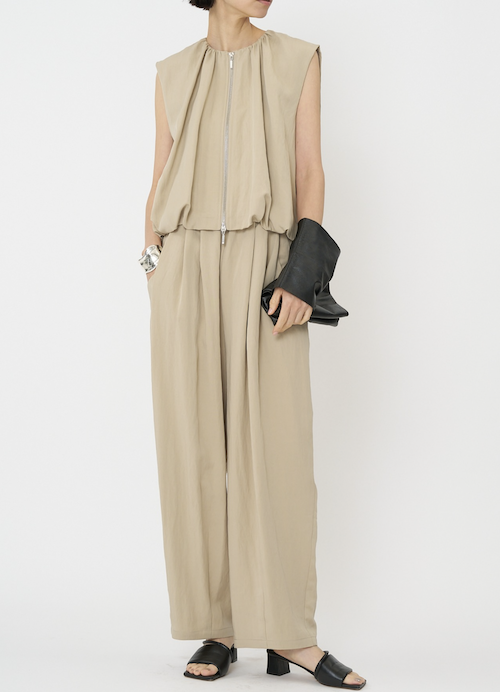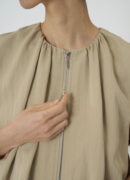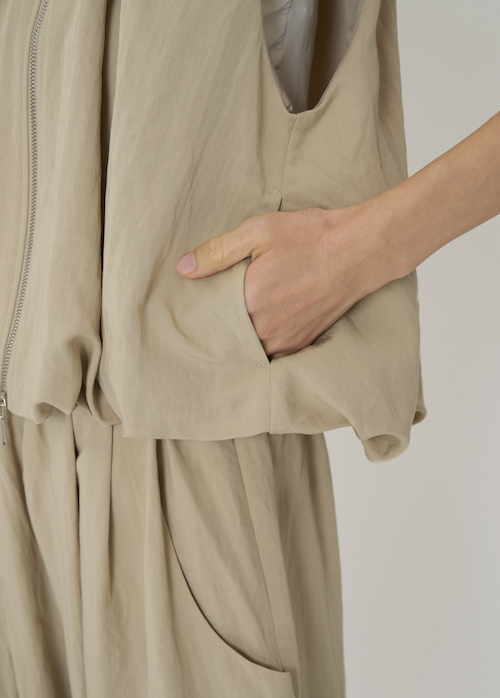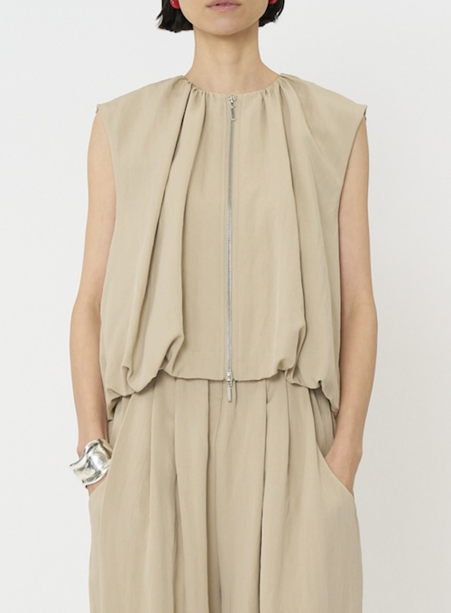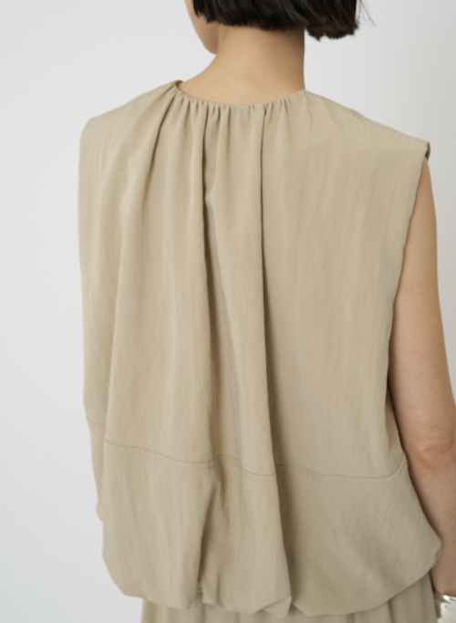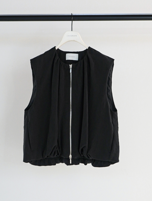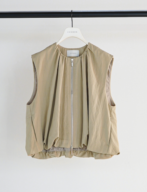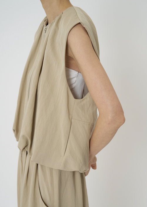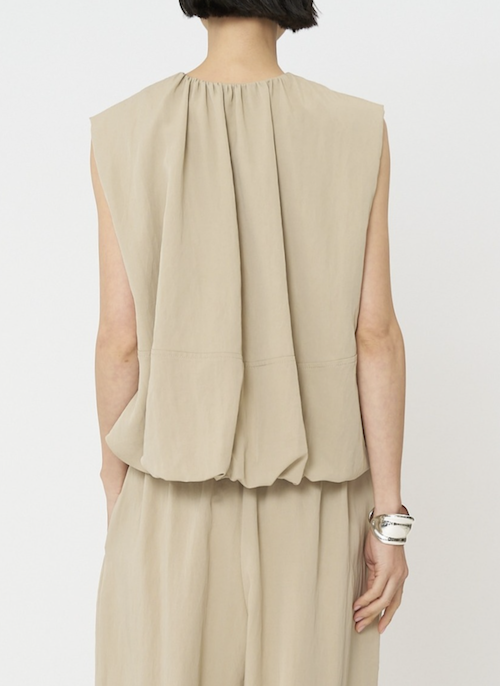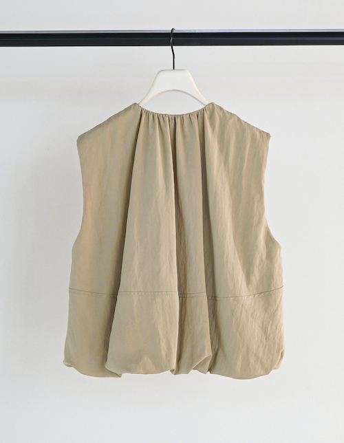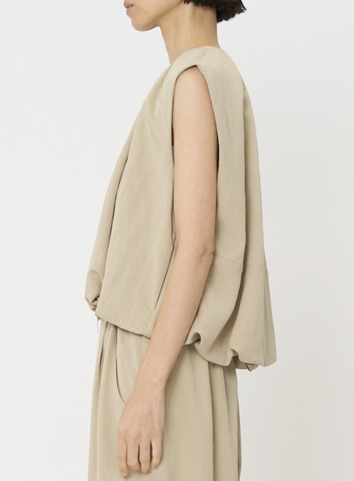 計算されたタックアンドギャザーでまとめたバルーンシルエットが映える、ショートレングスベストです。
