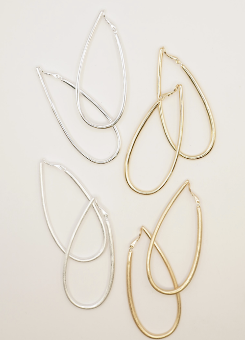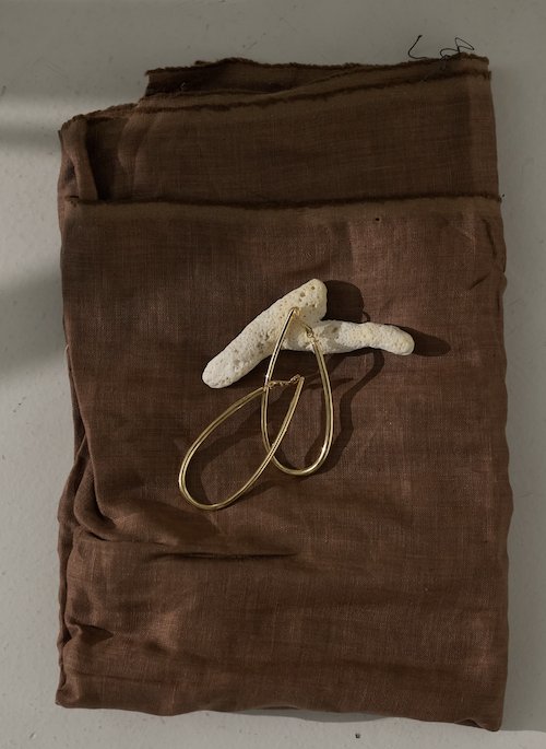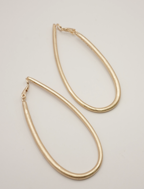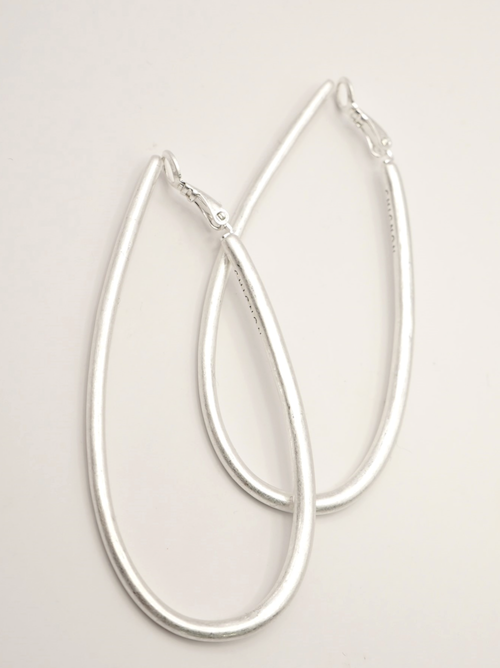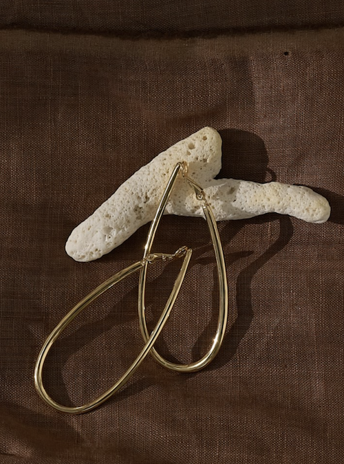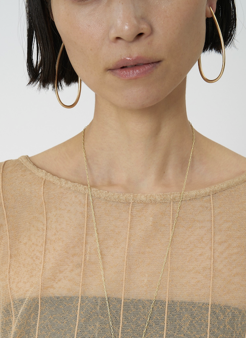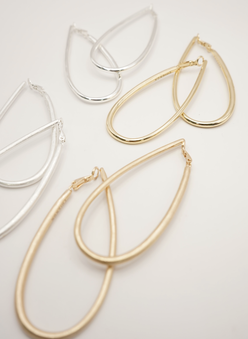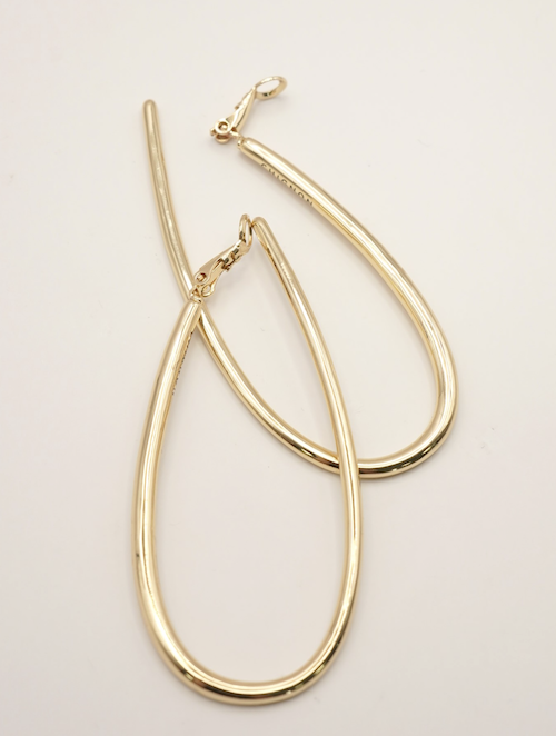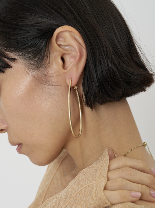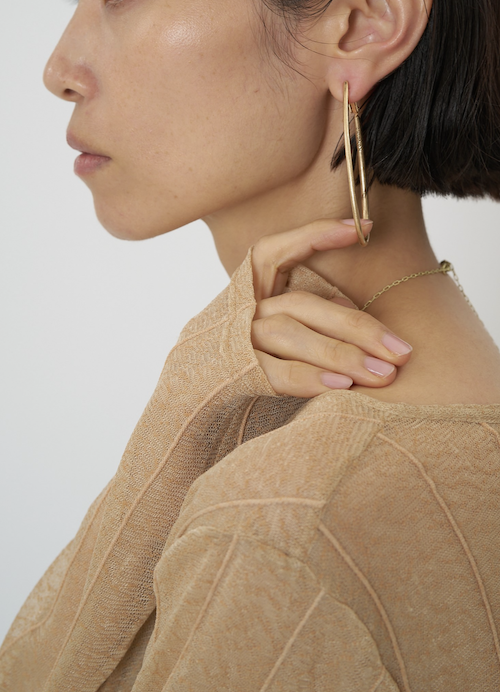 ドロップ型の大振りフープイヤリングは、前から見るとピアスをつけているようなシンプルな仕様にしています。