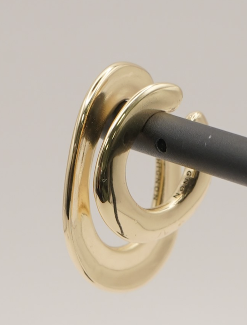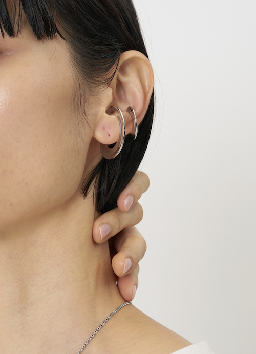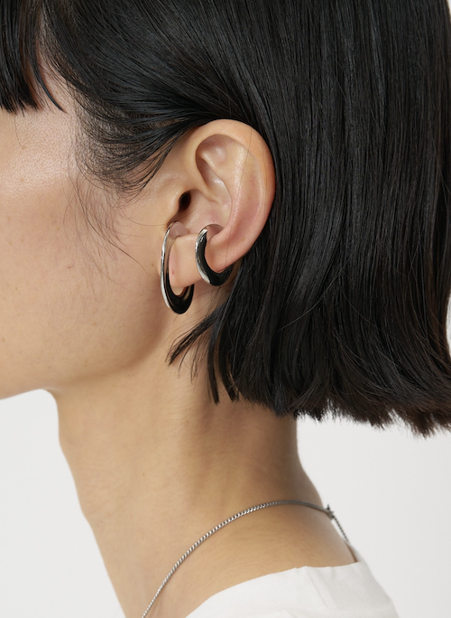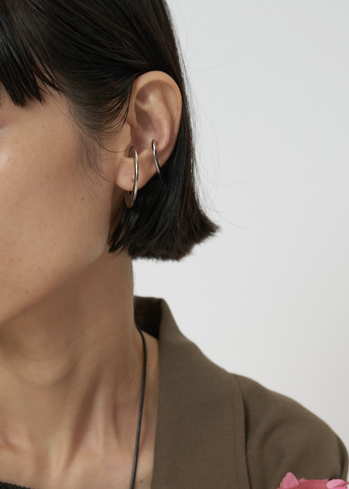 大きい方のイヤカフは耳の下の方につけると落ちつ気が良く、小さい方のイヤカフは耳上や耳たぶにもフィットするデザインとなっております。