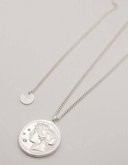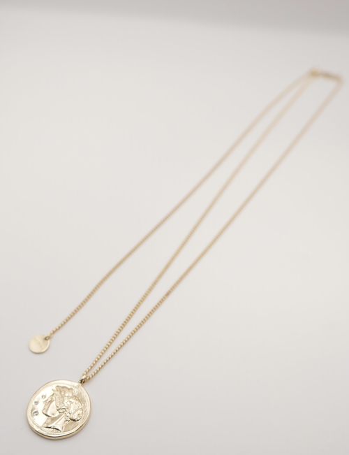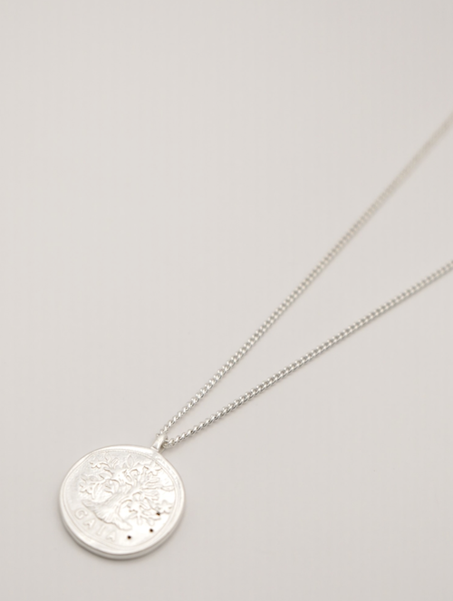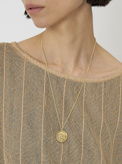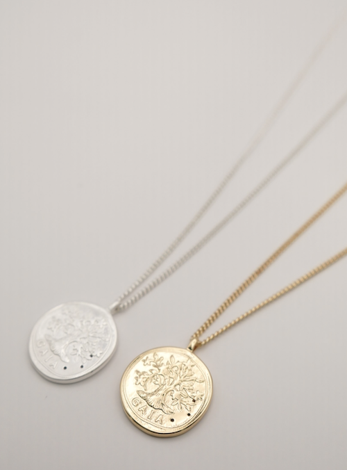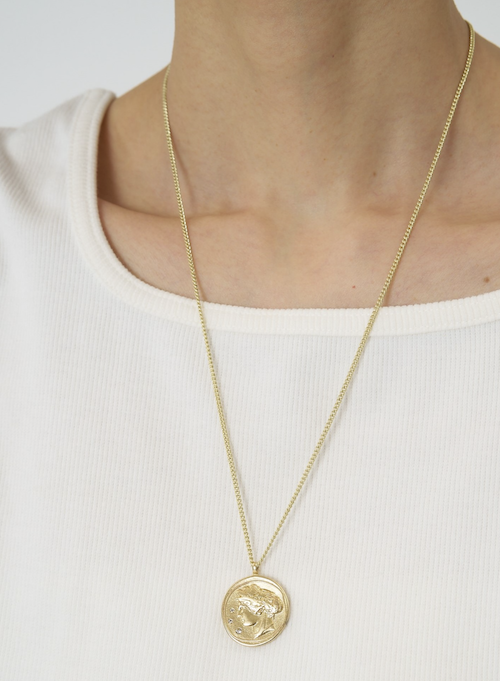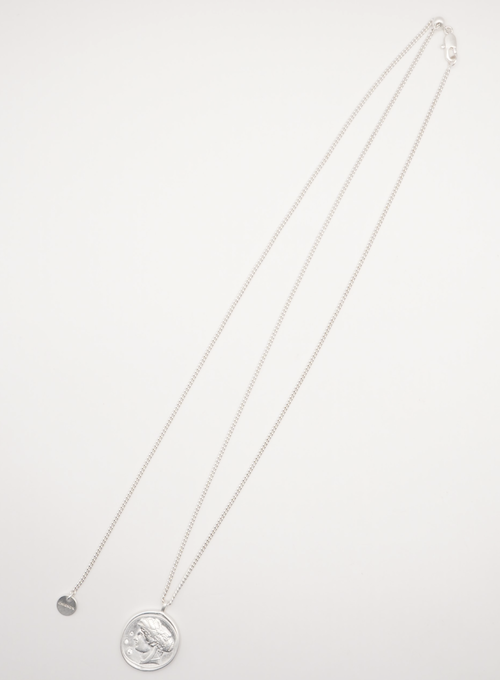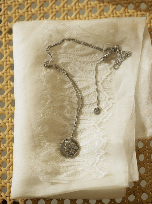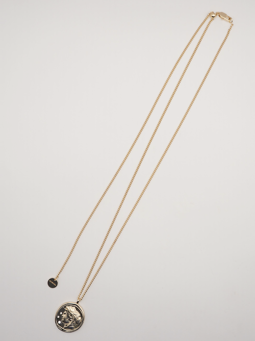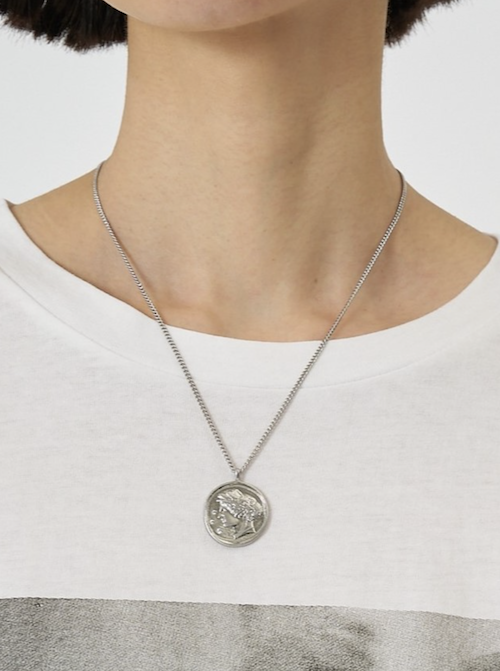 立体的に彫刻された横顔(表面)と生命力の象徴とされる木のモチーフ(裏面)のコインネックレスは、ヴィンテージライクなデザインが魅力的。
