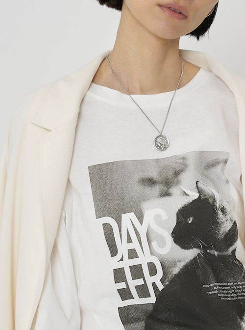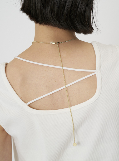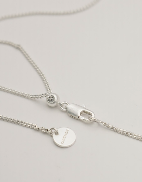 また、チェーンはスライドビーズで長さ調節が可能となっておりますので、お手持ちのネックレスとの重ね付けもしやすくなっております。先端の丸プレートには「CHIGNON」の刻印入り。